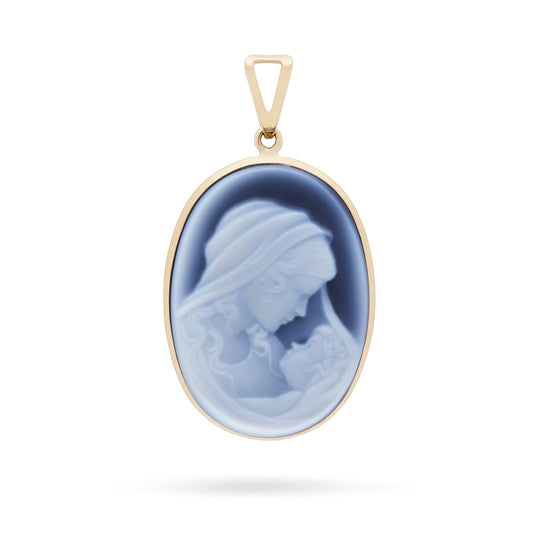 Oval Yellow Gold Pendant With Black Agate Cameo Portraying the Virgin Mary With Baby Jesus