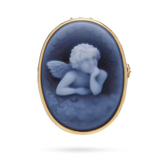 Oval Yellow Gold Brooch and Pendant With Black Agate Cameo Portraying a Putto