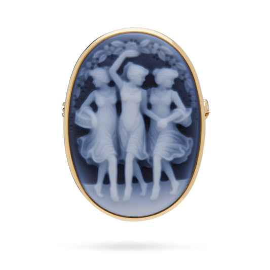 Oval Yellow Gold Brooch and Pendant With Black Agate Cameo Portraying the Three Graces