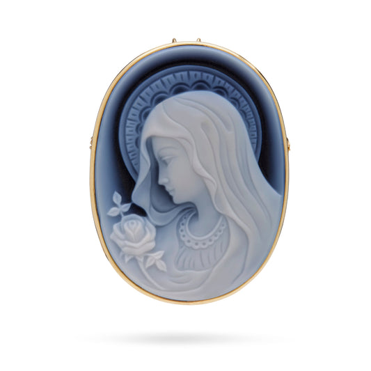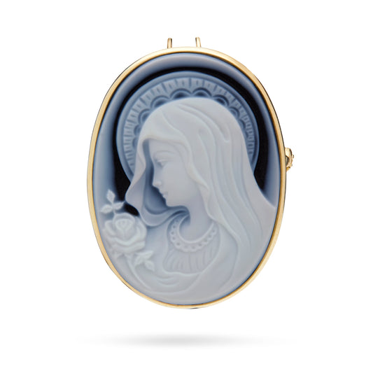 Yellow Gold Brooch and Pendant With Black Agate Cameo Portraying the Virgin Mary With a Rose
