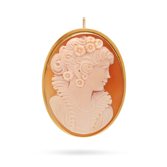 Yellow Gold Brooch and Pendant With Cameo Portraying a Woman and Worked Frame