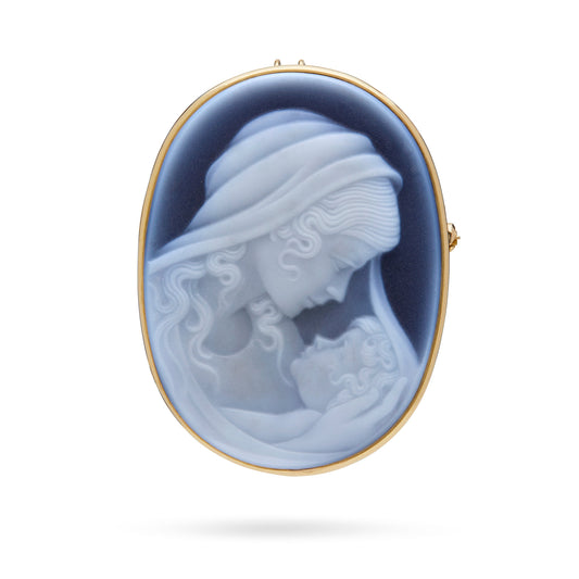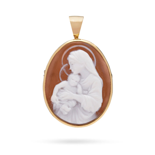 Oval Yellow Gold Brooch and Pendant With Cameo Portraying Virgin Mary With Baby Jesus