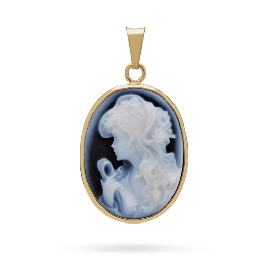 Oval Yellow Gold Pendant With Black Agate Cameo Portraying a Woman