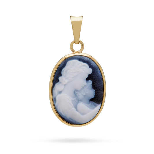 Oval Yellow Gold Pendant With Black Agate Cameo Portraying Mother Mary With Baby Jesus