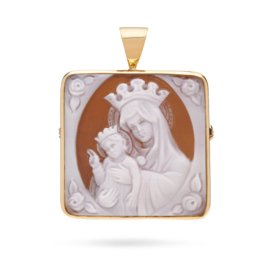 Square Yellow Gold Brooch and Pendant With Cameo Portraying Virgin Mary With Baby Jesus