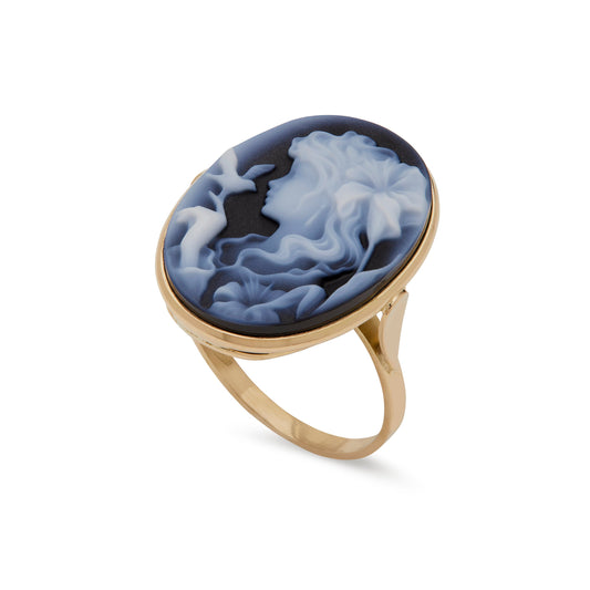 Yellow Gold Ring With Black Agate Cameo Portraying a Woman