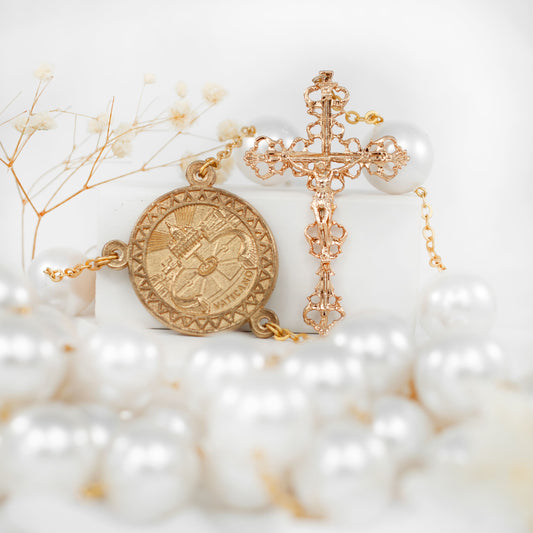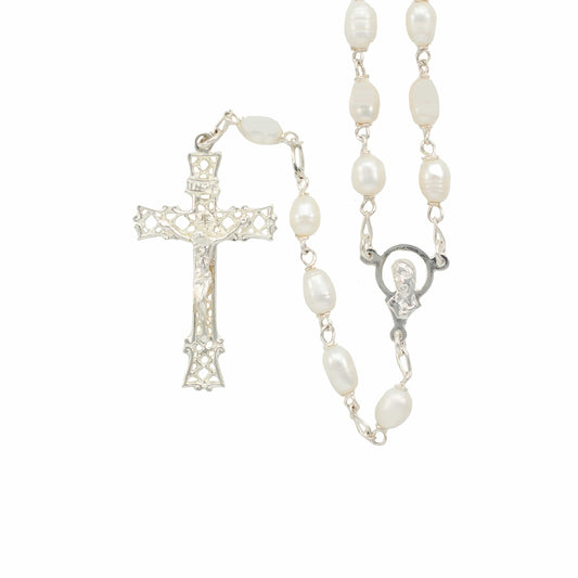 Sterling Silver Rosary with White Pearl Beads and Jubilee 2025 Logo