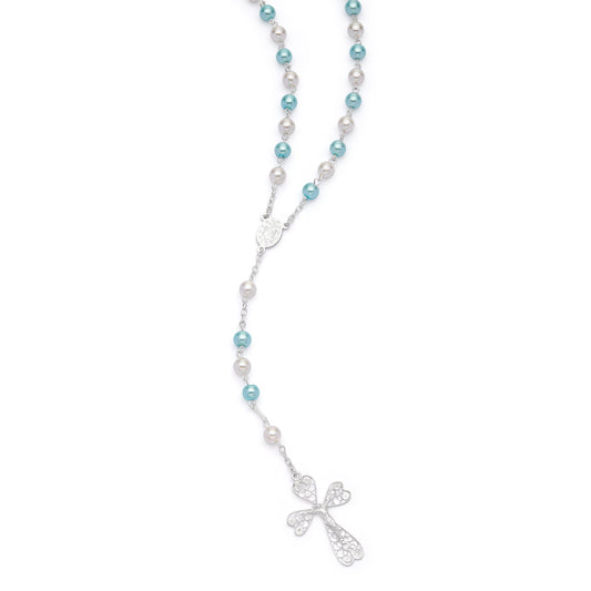 Sterling Silver Rosary Swarovski Crystal Pearls White and Light Blue Beads