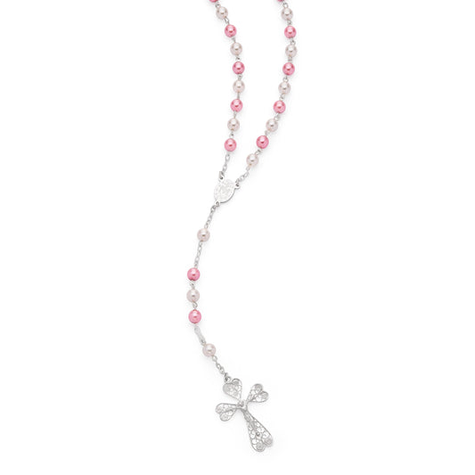 Sterling Silver Rosary Swarovski Crystal Pearls White and Pink Beads