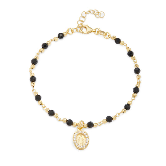 Gold-plated Sterling Silver Bracelet With Black Beads and Miraculous Medal With Cubic Zirconia Pendant
