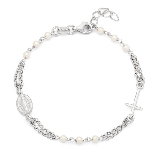 Sterling Silver Bracelet with White Beads Featuring the Miraculous Medal and a Cross