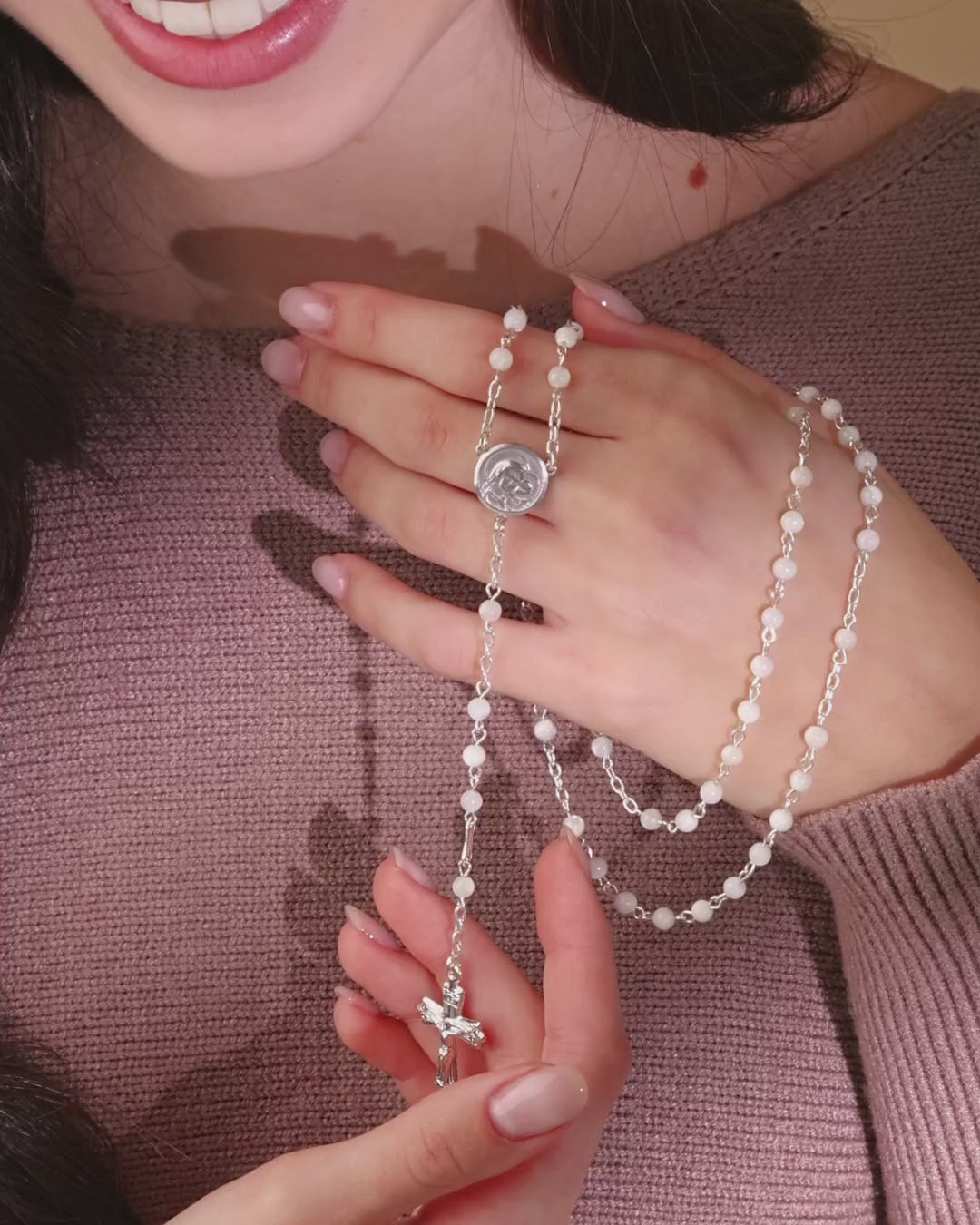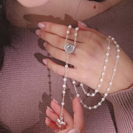 Dieser Rosenkranz ist aus 925er Silber gefertigt und mit runden Perlmuttperlen versehen, deren sanfter Glanz dem Stück eine ruhige und edle Ausstrahlung verleiht.
