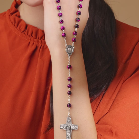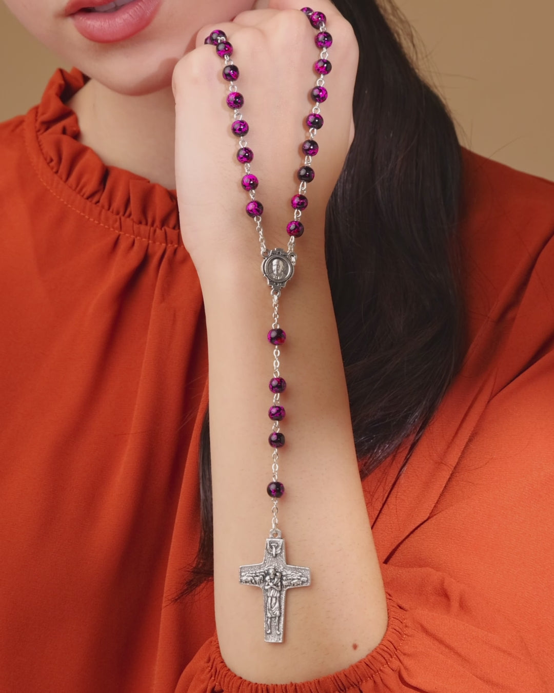 Rosenkranz aus buntem Glas mit Kreuz des Guten Hirten
