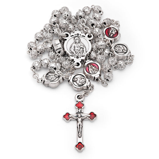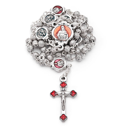 Portarosario Esmaltado Rojo Del Sagrado Corazón de Jesús Con Rosario Con Cuentas en Forma De Rosa