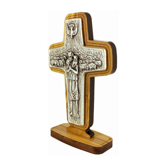 Cruz Del Buen Pastor De Mesa De Madera De Olivo Con Placa De Metal