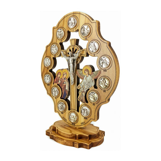 Crucifijo De Mesa Ovalado De Madera De Olivo De Cristo Resucitado Con Via Crucis