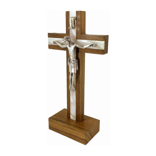 Crucifijo De Mesa De Madera De Nogal Con Incrustaciones De Nácar