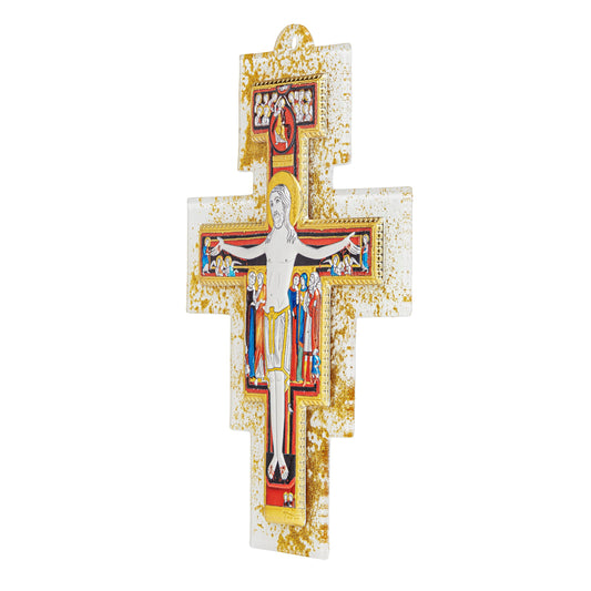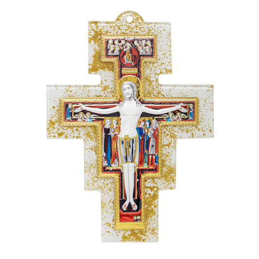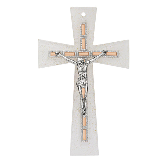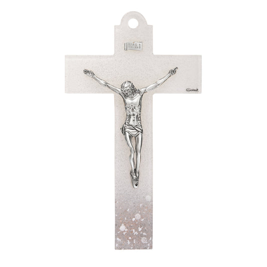Crucifijo Coloreado De Vidrio Veneciano Con Cuerpo De Resina Blanca Estilo Moderno