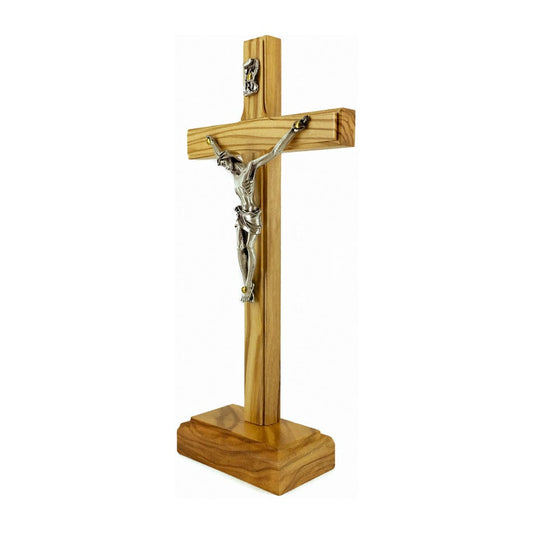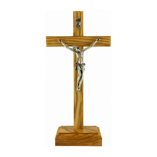 Crucifijo De Mesa De Madera De Olivo Con Cuerpo Plateado
