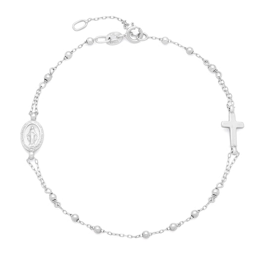 Pulsera Ajustable De Oro Blanco Con Medalla Milagrosa Y Cruz