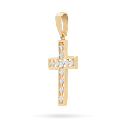 Cruz Hueca Colgante De Oro Amarillo Con Detalles en Forma De Rombo De Oro Blanco