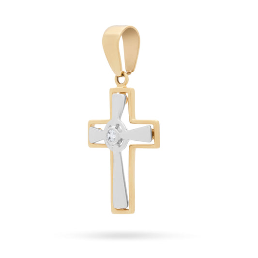 Cruz Hueca Colgante De Oro Amarillo Con Cruz Interna De Oro Blanco Y Circón Central