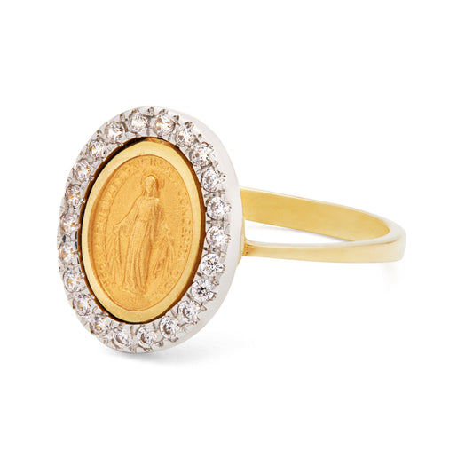 Anillo De Oro Con Medalla Milagrosa Con Detalles De Oro Blanco Y Circonitas Cúbicas