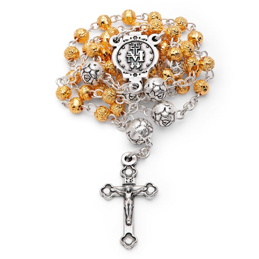 Portarosario Dorado Con La Virgen de la Medalla Milagrosa Y Rosario Con Cuentas en Forma De Rosa