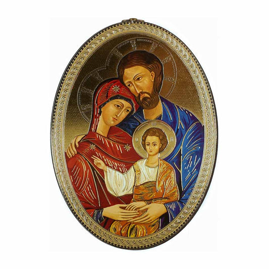 Icono De Madera Coloreado De La Sagrada Familia Con Placa De Plata Bilaminada Y Detalles Dorados