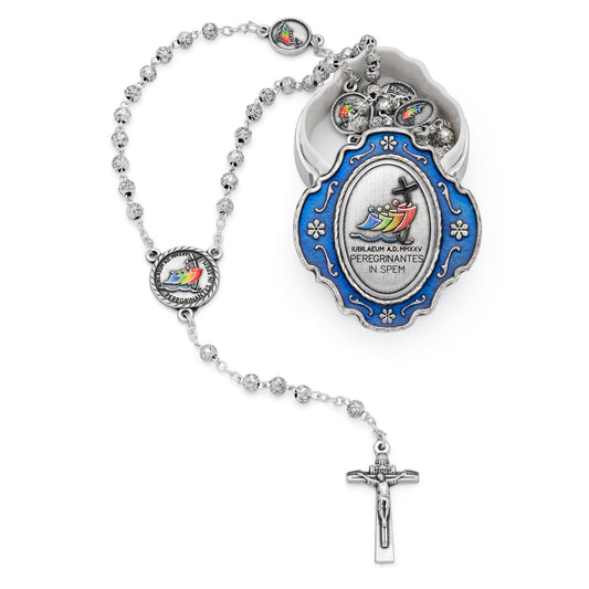 Portarosario Esmaltado Azul Del Jubileo 2025 Con Rosario Con Cuentas en Forma De Rosa