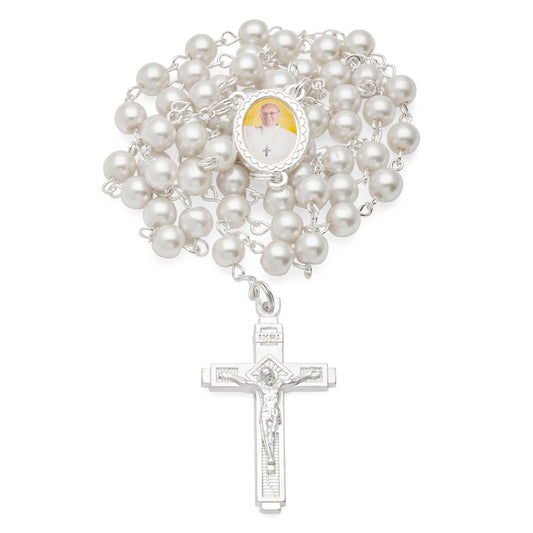 Rosario De Papa Francisco Con Cuentas De Cristal Blanco Con Copetes