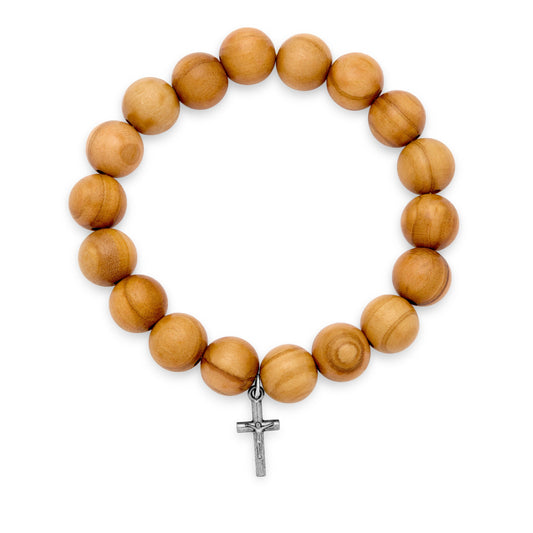 Pulsera Elástica en Madera De Olivo Con Pequeño Crucifijo