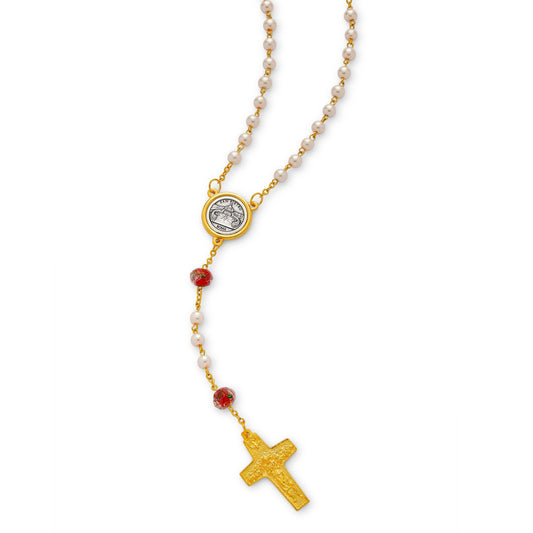 Rosario De Papa Francisco Con Cuentas De Vidrio Rojo Y Perla Sintética