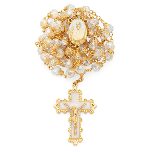 Rosario De Papa Francisco Con Cuentas De Cristal Blanco Con Copetes