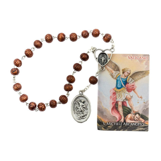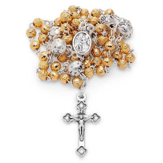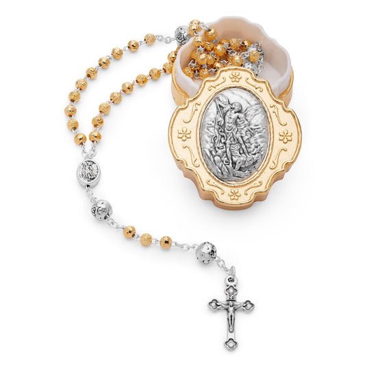 Portarosario Dorado Con San Miguel Y Rosario Con Cuentas en Forma De Rosa