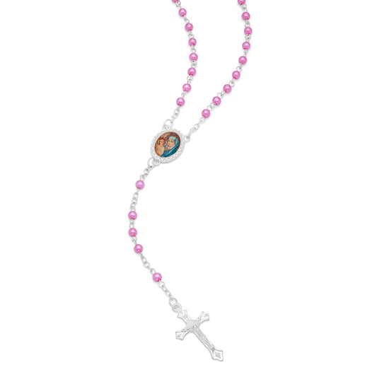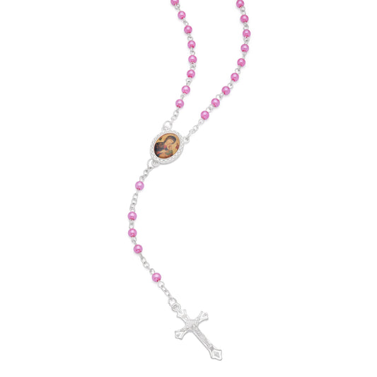 Portarosario De La Nuestra Señora Del Perpetuo Socorro En Forma De Cruz Con Rosario De Perlas Sintéticas Fucsia