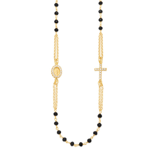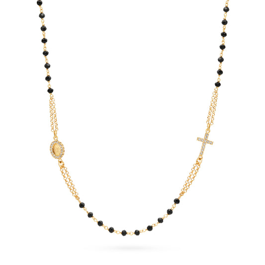 Collar Rosario De Doble Cadena De Plata Dorada Con Cuentas Negras Y Circonitas Cúbicas