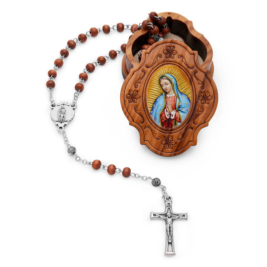 Portarosario De Madera De Olivo De Nuestra Señora de Guadalupe Con Rosario De Madera