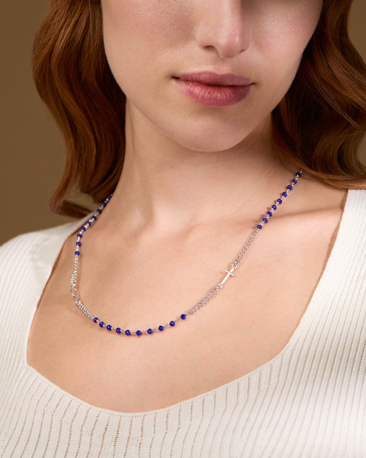 Collar Rosario De Doble Cadena De Plata Con Cuentas Azules