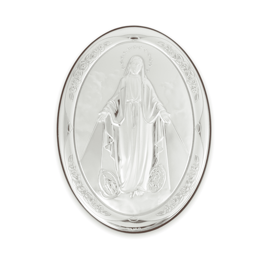 Panel De madera Con Detalles De Plata De La Virgen de la Medalla Milagrosa