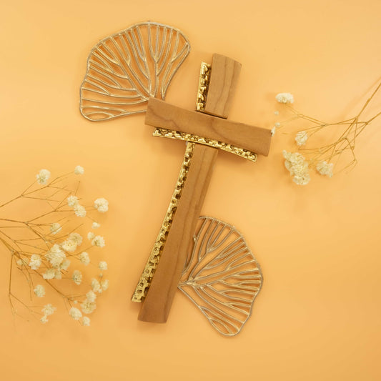Cruz Del Buen Pastor De Metal Con Trasera De Madera De Olivo
