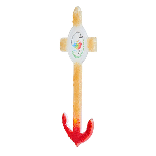 Cruz De Vidrio De Murano Del Jubileo 2025 En Forma de Ancla Con Tonalidades Rojas y Doradas