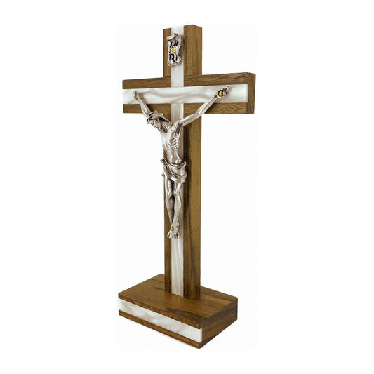 Crucifijo De Mesa De Nogal Con Incrustaciones De Nácar en La Cruz Y en La Base