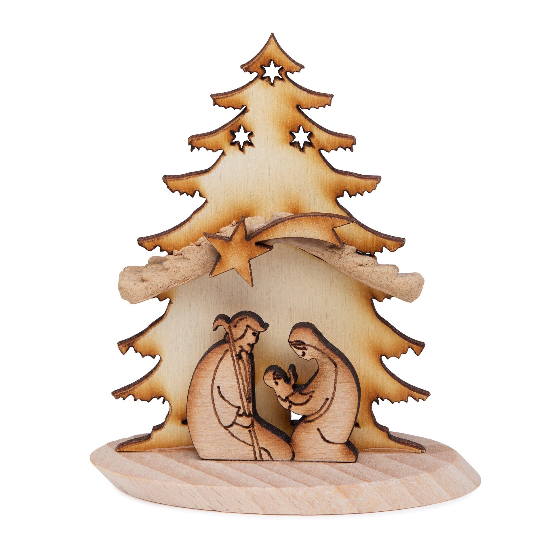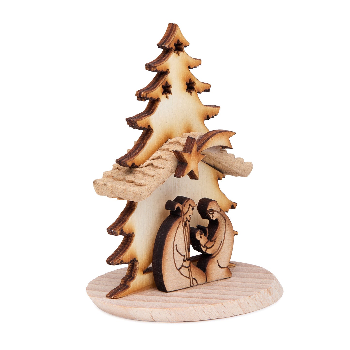 Este belén bellamente elaborado presenta un establo de madera integrado con un árbol de Navidad como parte del diseño. El árbol de Navidad forma el fondo del establo, con las figuras del belén colocadas debajo, creando una fusión armoniosa de dos símbolos tradicionales. El árbol y el establo se combinan perfectamente, haciendo de esta pieza una adición única y encantadora a tu decoración navideña.
