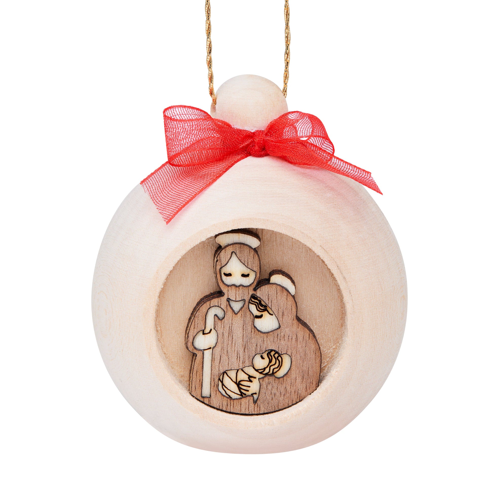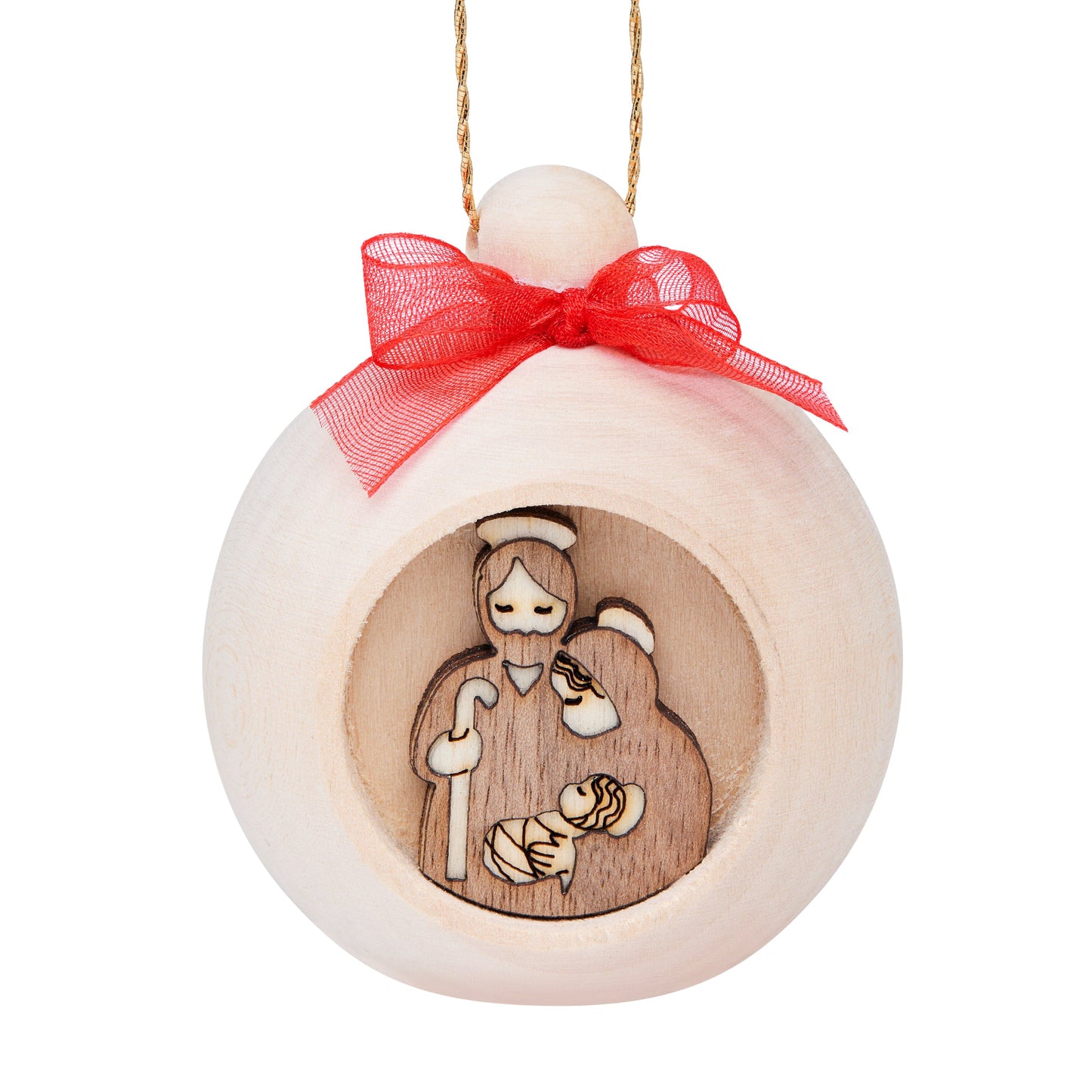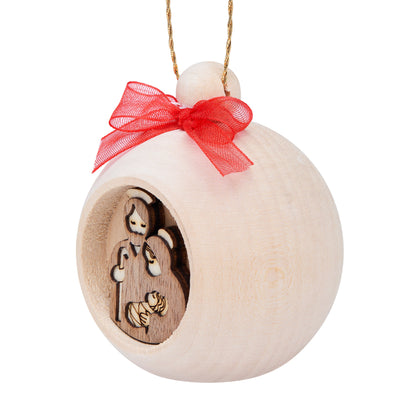 Bola De Navidad De Madera Con Belén Tallado Y Lazo Rojo