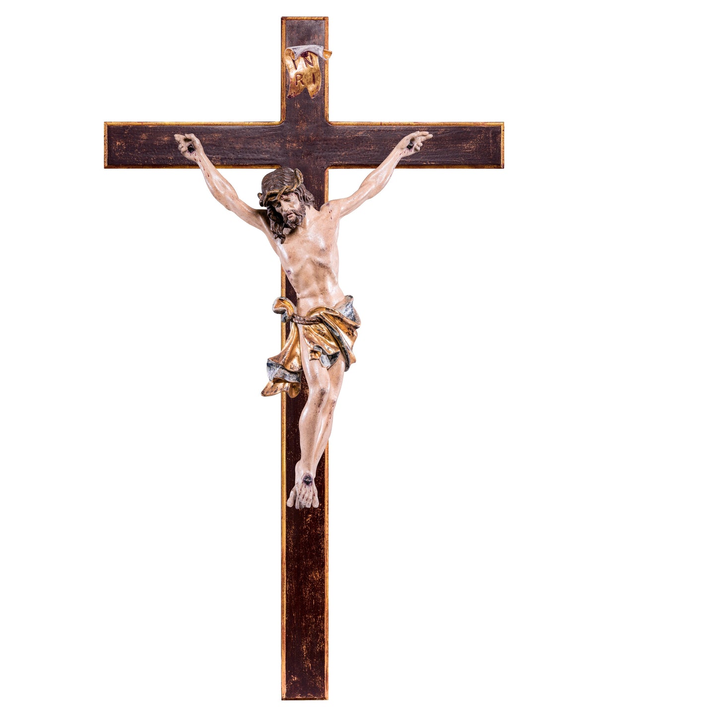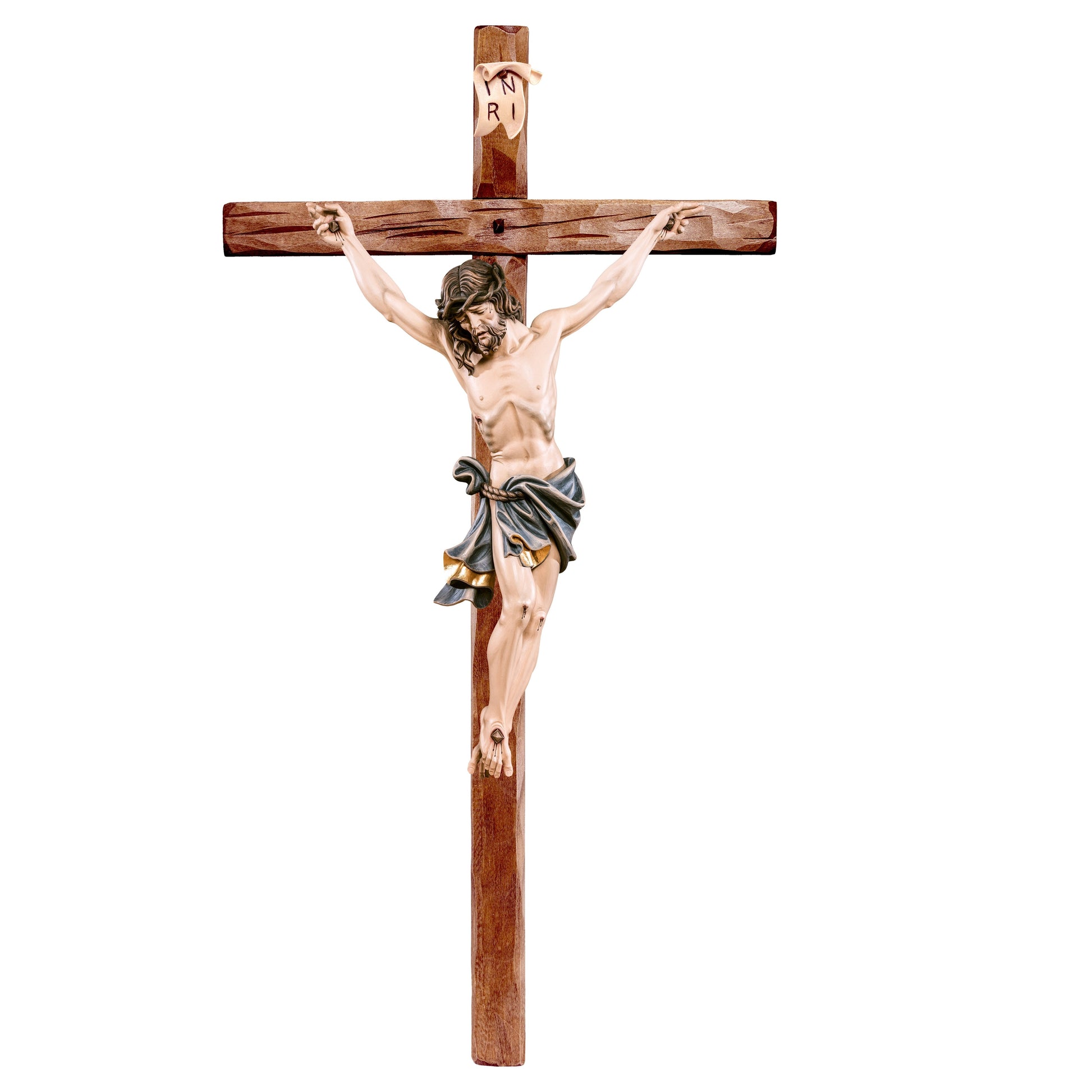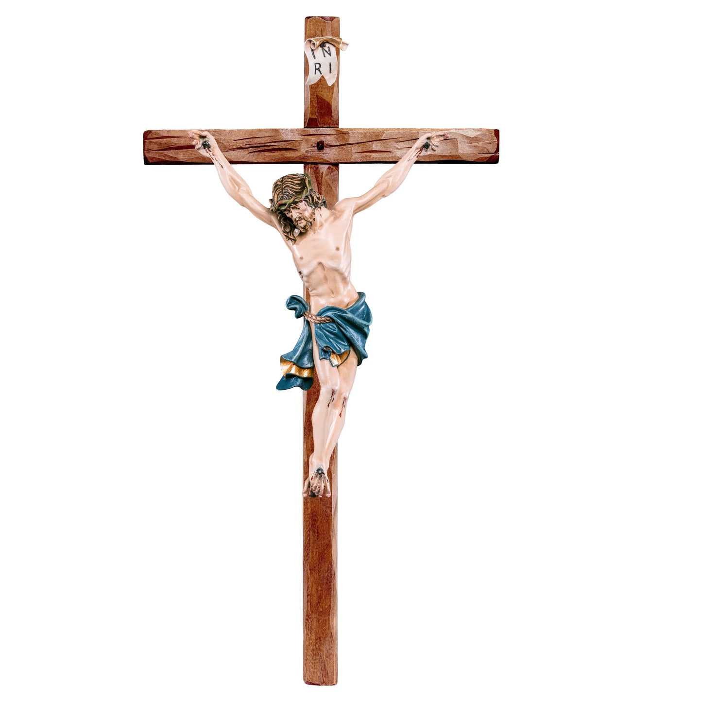 Cristo de los Alpes azul con cruz recta. Objeto realizado completamente a mano, proviene del Alto Adigio, y más precisamente de Val Gardena, donde la tradición de la escultura en madera prospera desde el siglo XVII.
