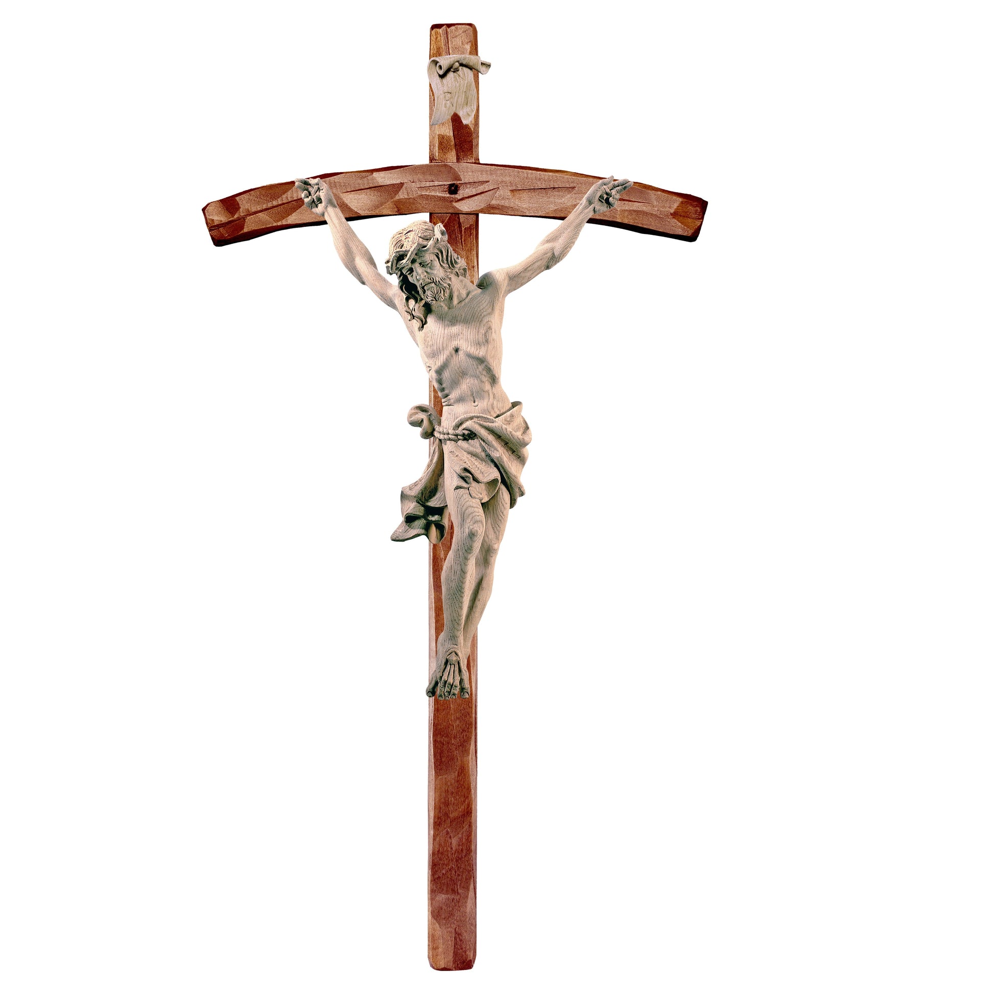 Cristo de los Alpes de roble con cruz pastoral. Este magnífico objeto ha sido completamente trabajado a mano en Val Gardena, siguiendo las técnicas escultóricas tradicionales típicas de la región del Alto Adigio, conocida por su histórica tradición en la elaboración de madera que se remonta al siglo XVII.