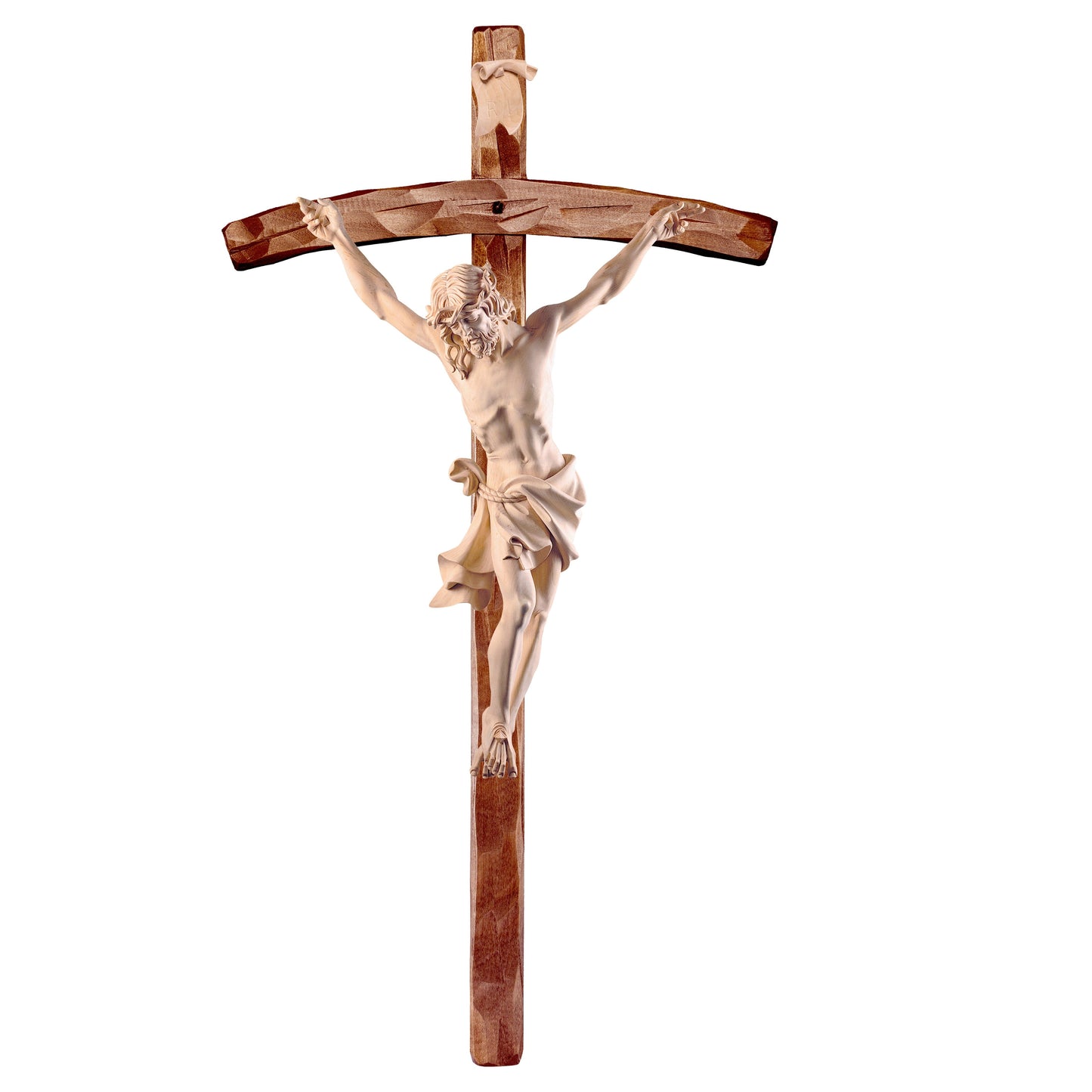 Cristo de los Alpes de tilo con cruz pastoral. Este magnífico objeto ha sido completamente trabajado a mano en Val Gardena, siguiendo las técnicas escultóricas tradicionales típicas de la región del Alto Adigio, conocida por su histórica tradición en la elaboración de madera que se remonta al siglo XVII.
