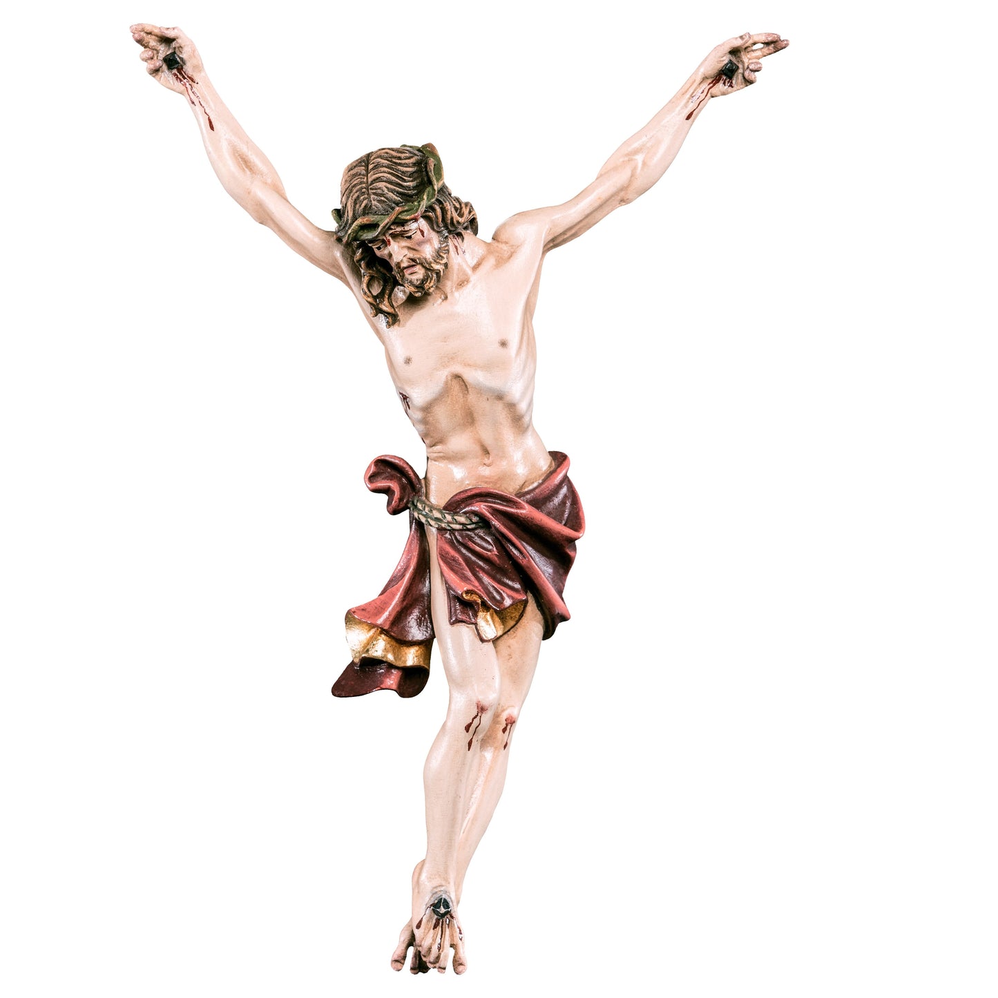 Cristo de los Alpes rojo. Este hermoso objeto ha sido realizado artesanalmente en Val Gardena, tallado y decorado a mano, siguiendo las técnicas transmitidas desde el siglo XVII.