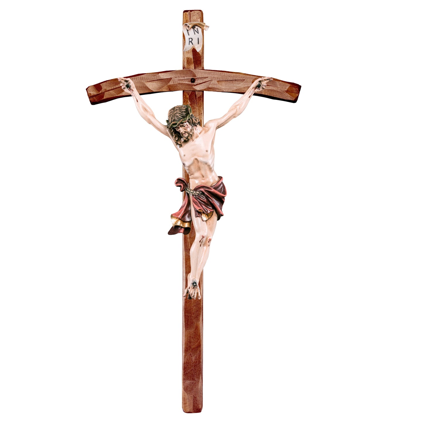 Cristo de los Alpes rojo con cruz pastoral. Este magnífico objeto ha sido completamente trabajado a mano en Val Gardena, siguiendo las técnicas escultóricas tradicionales típicas de la región del Alto Adigio, conocida por su histórica tradición en la elaboración de madera que se remonta al siglo XVII.